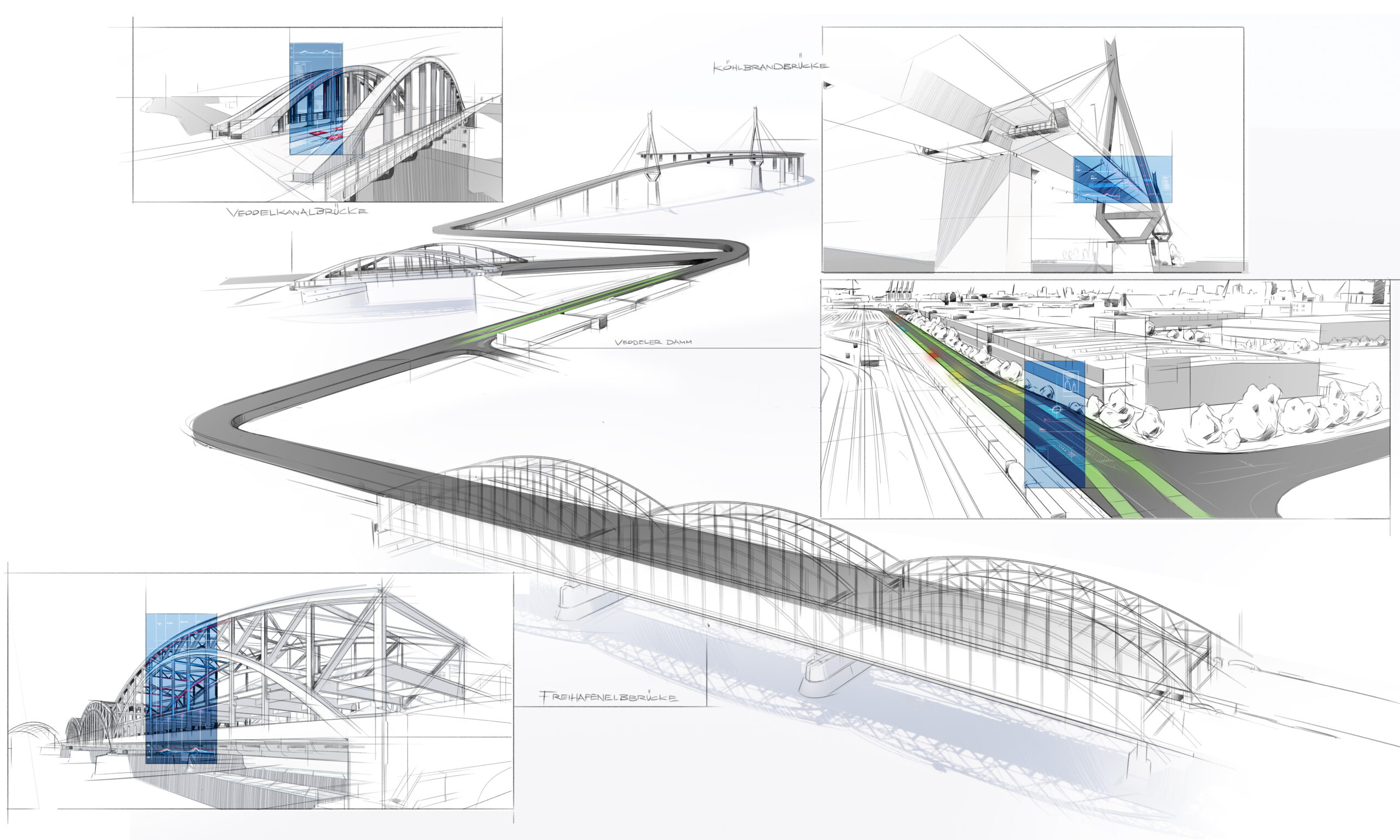 Aufbauend auf den Erfahrungen aus dem Projekt smartBRIDGE Hamburg, welches den Digitalen Zwilling der Köhlbrandbrücke entwickelt hat, geht das neue Vorhaben deutlich weiter. Statt eines einzelnen Bauwerks wird nun ein ganzes System aus mehreren Brücken und einem Straßenabschnitt digital erfasst, vernetzt und analysiert.
